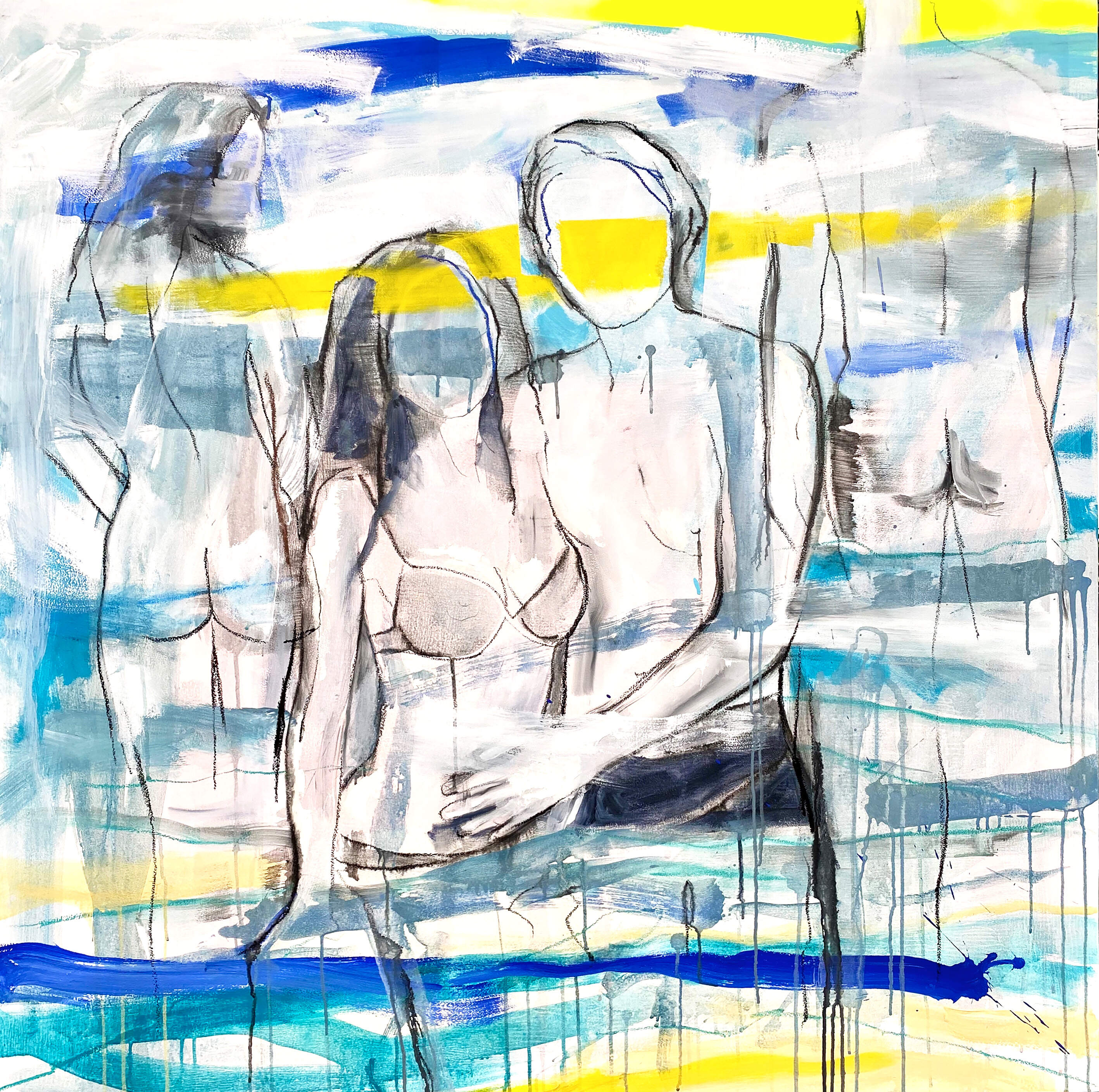Una coppia si stringe in un affettuoso abbraccio, i corpi bagnati dall'acqua del mare in cui sono immersi. Dietro si intravedono due figure nude di spalle, potrebbero rappresentare il passato, la libertà ma anche la fragilità e la solitudine. Una coppia si stringe in un affettuoso abbraccio, i corpi bagnati dall'acqua del mare in cui sono immersi. Dietro si intravedono due figure nude di spalle, potrebbero rappresentare il passato, la libertà ma anche la fragilità e la solitudine.